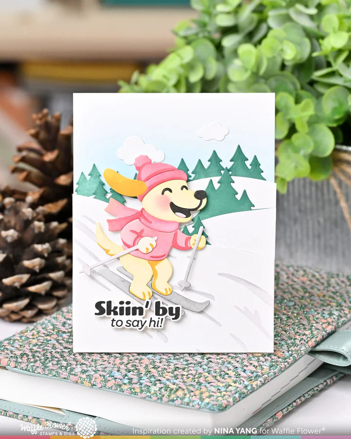 This set includes a pup with winter accessories and skis. Cut the pieces from cardstock and use the stencil to add shadows and details. The dies are numbered for easy assembly.